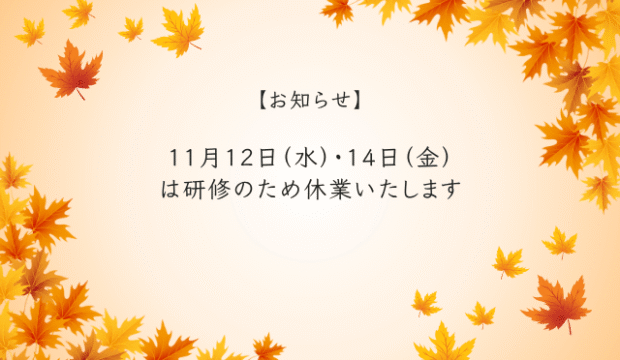 12月お休みのおしらせ 2025.12.01 お知らせ Tweet Share Hatena Pocket RSS feedly Pin it 12月17日(水)、22日(月) 研修会の為お休みさせていただきます。 年末年始は前日までのご予約の方のみお受けいたします。 年末年始は通常営業いたしておりますが、今のところはご予約の空きが少しになっております。 Tweet Share Hatena Pocket RSS feedly Pin it 【お知らせ】11月12日(水)・14日(金)は研修のため休業いたします 前の記事